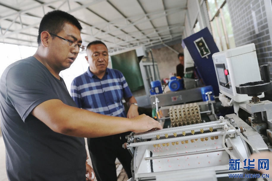 6月9日,李宏和李鵬博在廠房里操作自動(dòng)播種機(jī)播種辣椒苗。新華網(wǎng)曹楨攝
