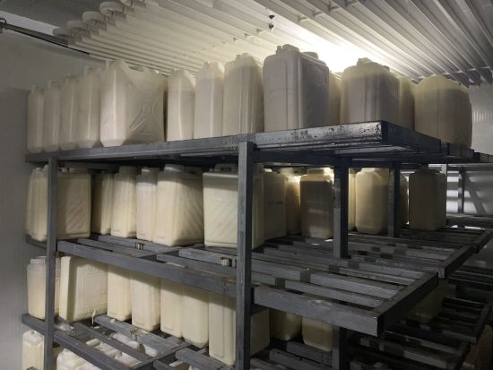 圖為照富經貿有限責任公司的冷庫,一桶桶從牧戶家收集來的馬奶被整齊排列。