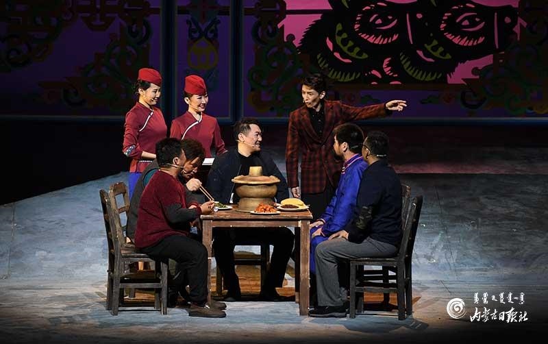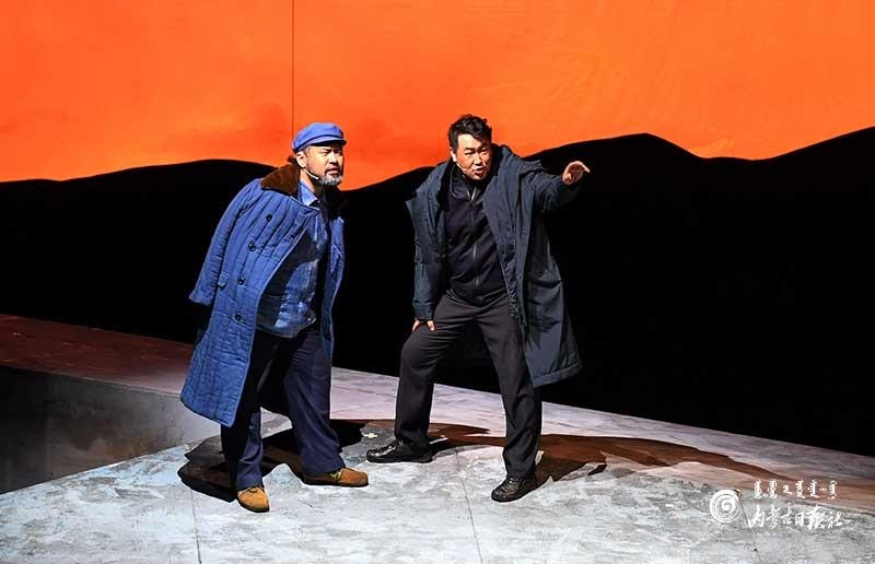 參演《紅手印》的都是來(lái)自草原的蒙古族演員,不僅要完成漢語(yǔ)的臺(tái)詞,還要熟練自然地講出大量?jī)?nèi)蒙古西部方言對(duì)白?!皩?duì)于話劇演員來(lái)說(shuō),臺(tái)詞功底太重要了。為了練好方言,我們好多演員早起練功的時(shí)候嘴里都念念有詞地說(shuō)著西部方言?!毖輪T烏仁朝魯門(mén)說(shuō)。他扮演的新扎木村主任令人印象深刻,一個(gè)一心想帶百姓致富卻屢遭失敗的老黨員形象?!爸氨硌輾v史題材的話劇大多是從影像和資料了解人物,這部戲的題材貼近觀眾們的現(xiàn)實(shí)生活,必須接地氣才能得到認(rèn)可。我通過(guò)寫(xiě)人物小傳的方式,深挖村主任的人物個(gè)性和從失望到燃起希望的內(nèi)心世界,讓觀眾能夠認(rèn)可這個(gè)形象?!睘跞食旈T(mén)說(shuō)。