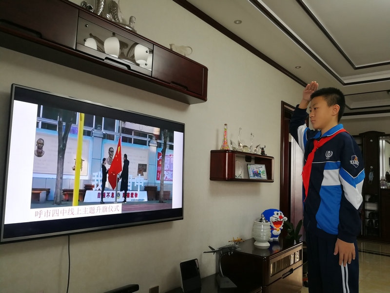 伴隨著激昂的《義勇軍進(jìn)行曲》,中小學(xué)生肅立屏幕前,看著冉冉升起的五星紅旗,高唱國(guó)歌,行隊(duì)禮,表達(dá)對(duì)偉大祖國(guó)的無(wú)限熱愛(ài)和崇高敬意。