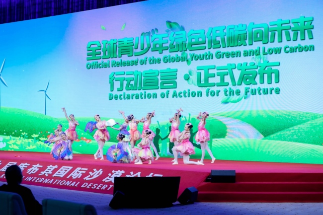 中福會少年兒童代表在論壇會議舞臺上帶來了創(chuàng)意獨(dú)特的“青少年、沙漠、未來”特別活動。通過少兒舞蹈與數(shù)字人互動表演的創(chuàng)新形式發(fā)布“全球綠色低碳發(fā)展青少年宣言”。