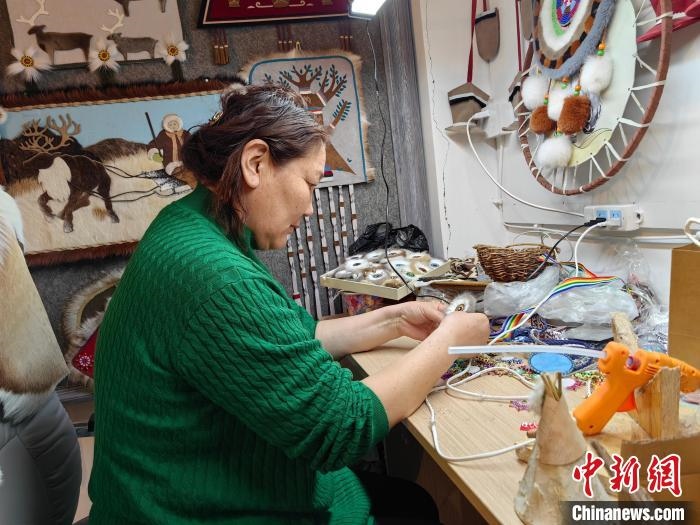 2月21日,在內(nèi)蒙古呼倫貝爾市鄂溫克族自治旗一家手工藝品工作室內(nèi),烏仁在制作太陽花手工藝品?! ∮诩? 攝