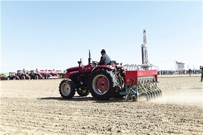 在臨河區(qū)狼山鎮(zhèn)光明村萬(wàn)畝小麥?zhǔn)痉秷@區(qū),幾十輛大型農(nóng)機(jī)具整齊排列、蓄勢(shì)待發(fā)?!伴_(kāi)播!”隨著光明村黨支部書(shū)記、糧食種植大戶代表郭成剛一聲號(hào)令,農(nóng)機(jī)手駕駛著播種機(jī)奔向沃野,伴著機(jī)械轟鳴,犁刀入地,一粒粒小麥種子被覆進(jìn)土中。