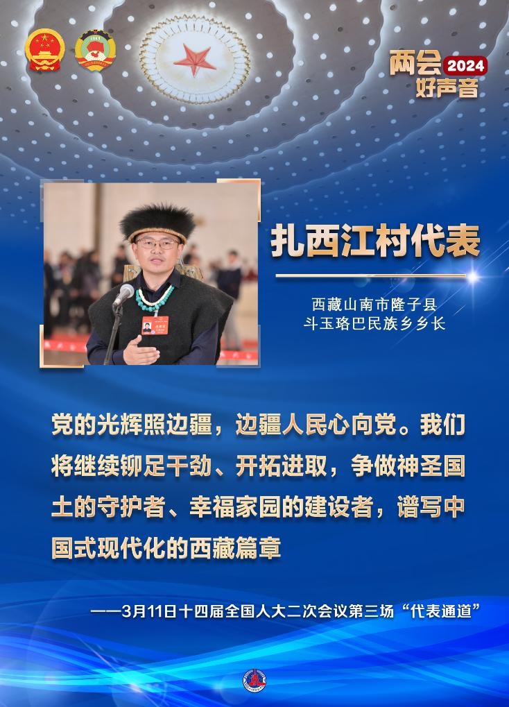 身著珞巴族服飾的西藏山南市隆子縣斗玉珞巴民族鄉(xiāng)鄉(xiāng)長(zhǎng)扎西江村代表走上通道,并帶來好消息:位于斗玉鄉(xiāng)的珞巴民族歷史文化展覽館即將開館。