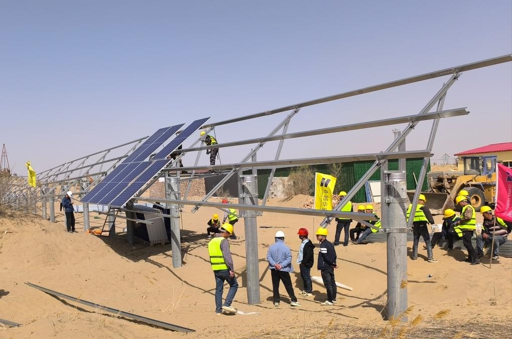記者在新華林場民樂作業(yè)區(qū)看到,與其他作業(yè)區(qū)的造林治沙方式相比,這里既沒有栽樹,也沒有種草,而是在沙地里“栽”下了一個個水泥樁。葛文斌告訴記者:“這里是防沙治沙和風(fēng)電光伏一體化工程項目區(qū)?!浴鄻毒褪菫楹笃诎惭b光伏板、建設(shè)光伏電站做準(zhǔn)備。在光伏板上發(fā)電的同時,我們還可以在光伏板下種植固沙植物,幫助地表植被恢復(fù),達(dá)到既能發(fā)電‘生金’又能實現(xiàn)沙化土地縮減的雙重功效?!保ㄓ浾呃钤破健⒑罹S軼)