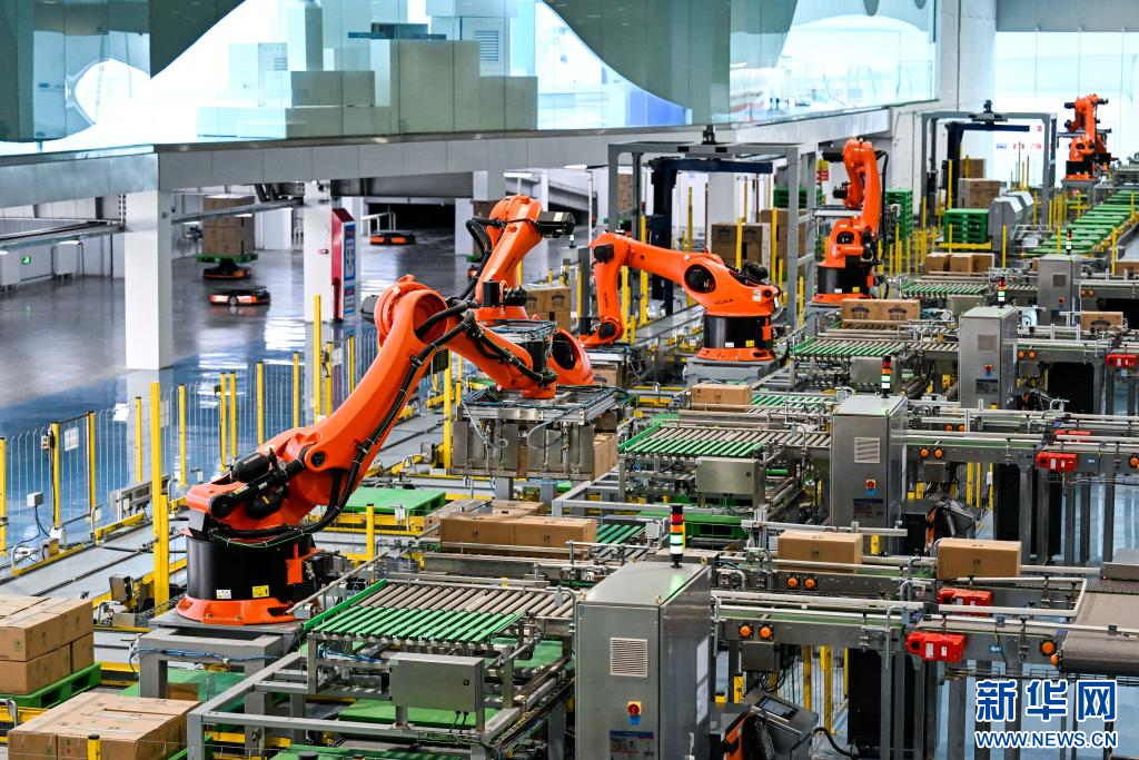 1月9日,在呼和浩特市伊利現(xiàn)代智慧健康谷液態(tài)奶全球智造標(biāo)桿基地,機(jī)械臂在碼放裝箱的奶制品。
