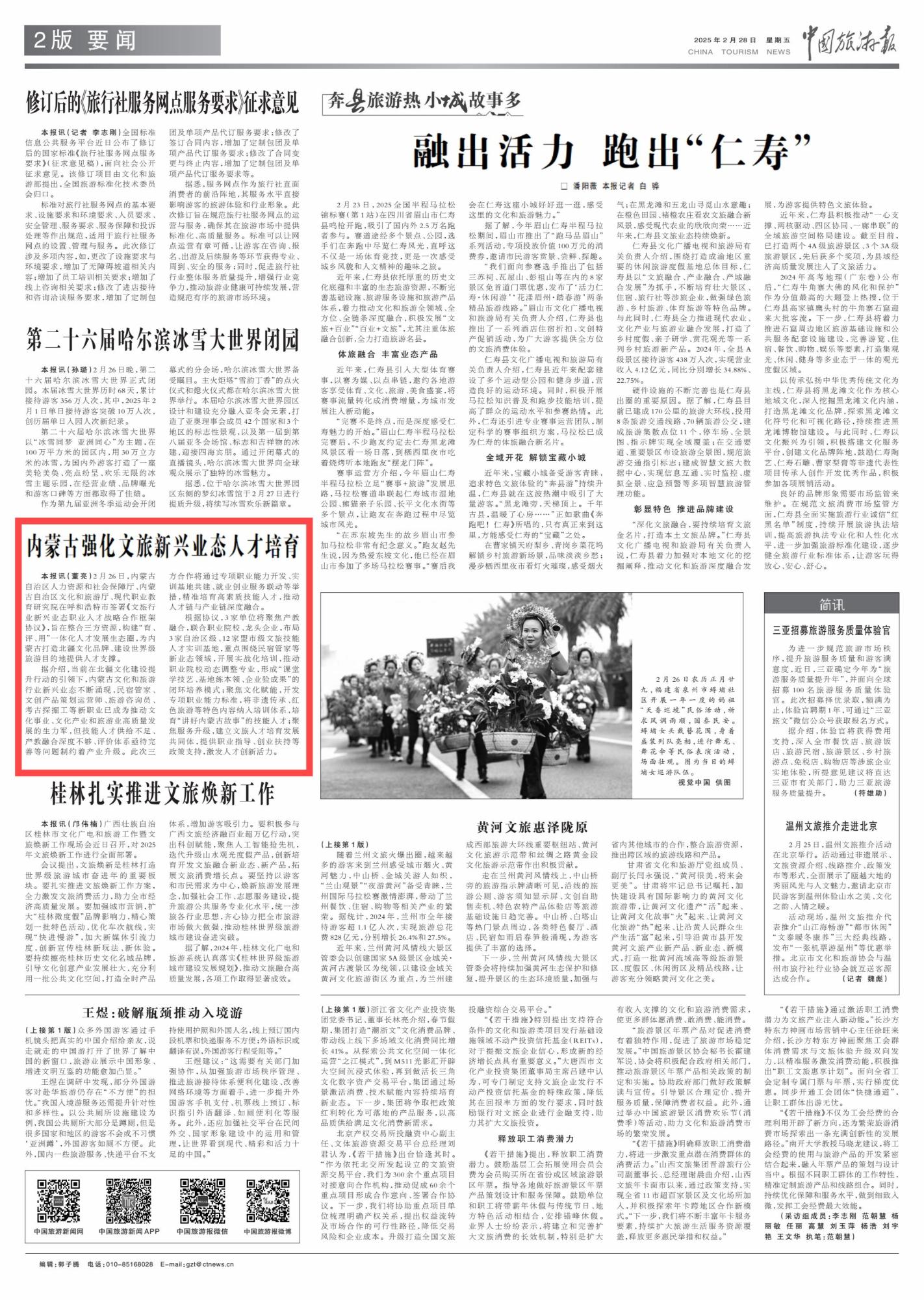 2015年2月28日,《中國旅游報》第2版刊發(fā)題為《內蒙古強化文旅新興業(yè)態(tài)人才培育》的消息,報道了內蒙古整合三方資源,構建“育、評、用”一體化人才發(fā)展生態(tài)圈,為內蒙古打造北疆文化品牌、建設世界級旅游目的地提供人才支撐。