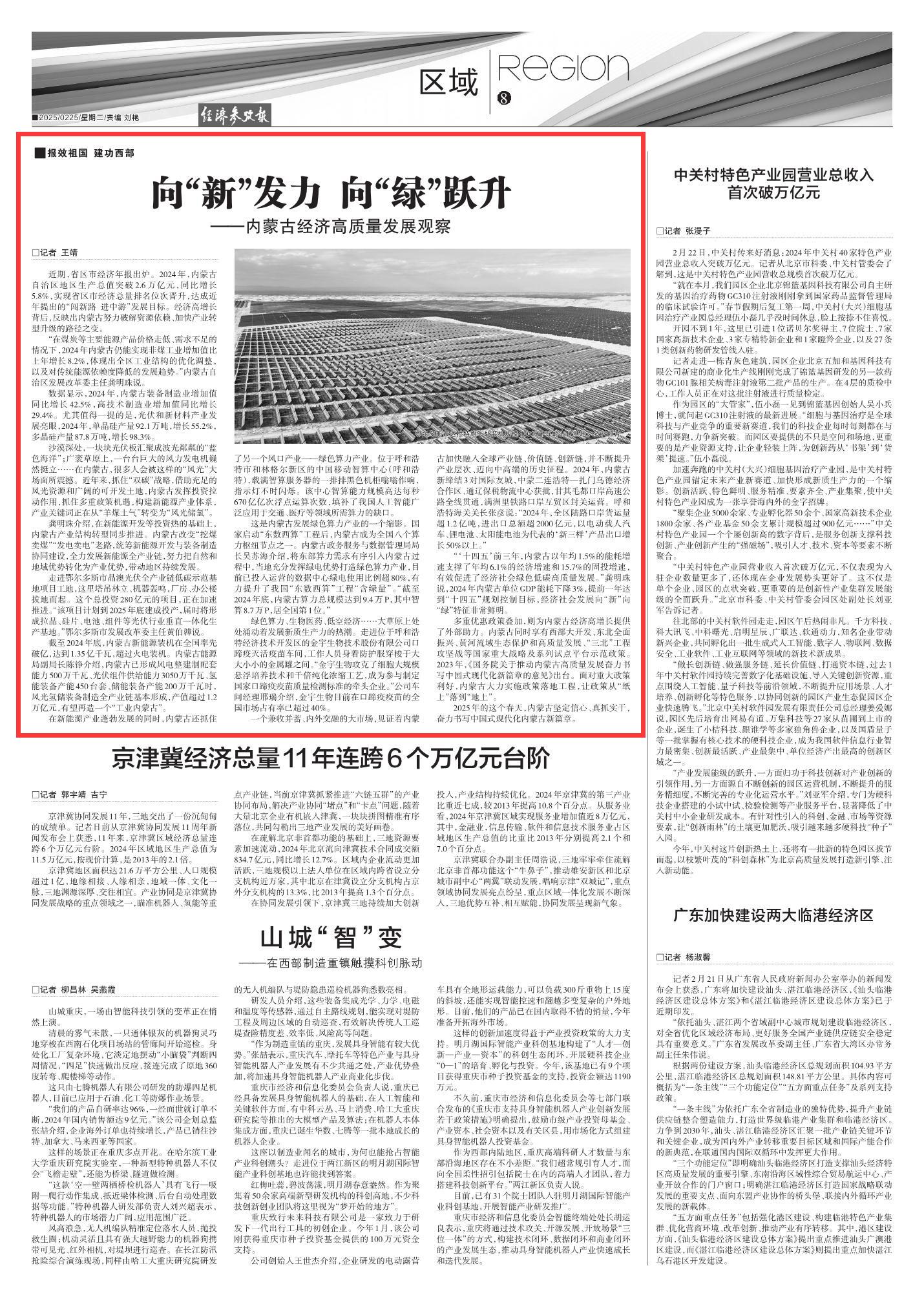 2025年2月25日《經(jīng)濟參考報》第8版刊發(fā)了《向“新”發(fā)力 向“綠”躍升——內(nèi)蒙古經(jīng)濟高質量發(fā)展觀察》的文章,報道了多重優(yōu)惠政策疊加,為內(nèi)蒙古經(jīng)濟高增長提供了外部助力,經(jīng)濟社會發(fā)展向“新”向“綠”特征非常鮮明,讓政策從“紙上”落到“地上”。
