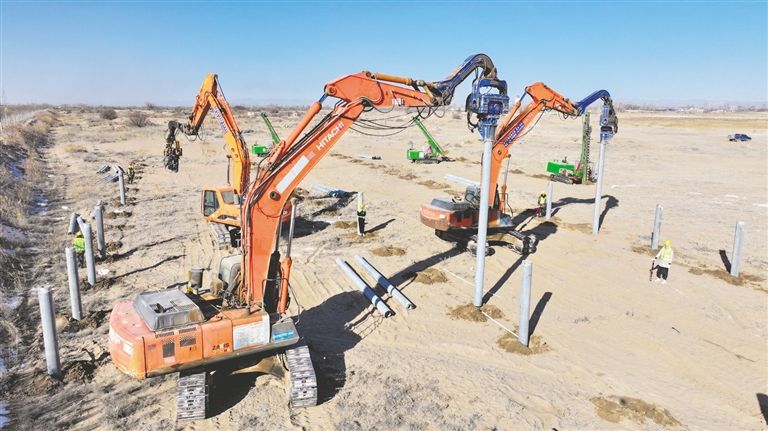 “目前打樁機(jī)、引孔機(jī)等各類機(jī)械已到場,正在進(jìn)行PHC預(yù)制管樁基礎(chǔ)施工,每天打樁大約1300多根,3月底完成打樁工程,接下來還將進(jìn)行支架和光伏組件的安裝,為后續(xù)220kV升壓站施工、電氣安裝調(diào)試和板下生態(tài)治理施工做好準(zhǔn)備,整體項(xiàng)目預(yù)計于6月底完工?!卑蛷┠谞柺蟹郎持紊澈惋L(fēng)電光伏一體化工程臨河區(qū)20萬千瓦光伏項(xiàng)目副經(jīng)理焦鋌說。