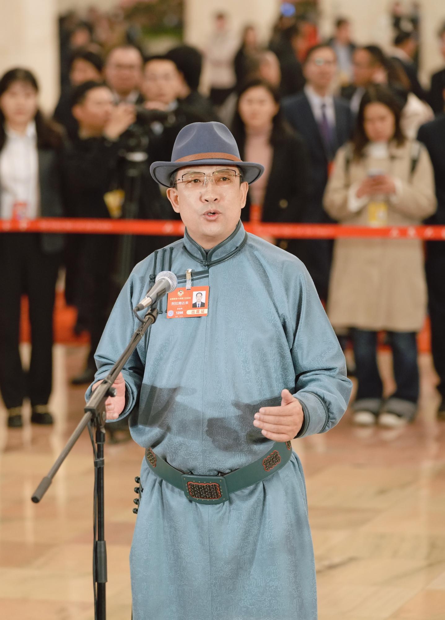 3月10日,全國政協(xié)十四屆三次會議第三場“委員通道”集體采訪活動在北京人民大會堂舉行。住內(nèi)蒙古全國政協(xié)委員阿拉騰達來接受媒體采訪。草原云記者 王鵬 攝