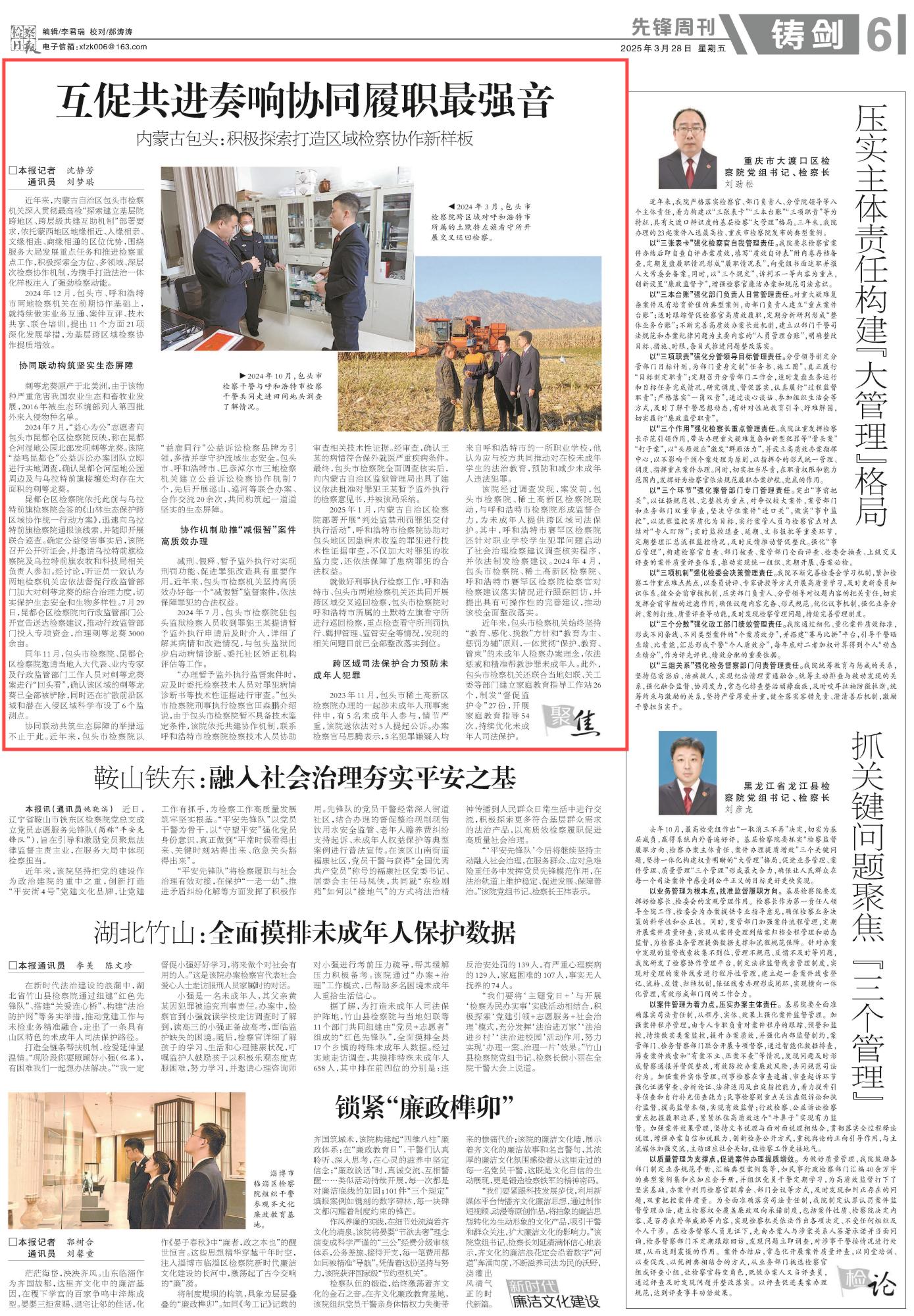 2025年3月28日,《檢察日報》第6版刊發(fā)題為《互促共進奏響協(xié)同履職最強音 內(nèi)蒙古包頭:積極探索打造區(qū)域檢察協(xié)作新樣板》的文章,報道了內(nèi)蒙古自治區(qū)包頭市檢察機關深入貫徹最高檢“探索建立基層院跨地區(qū)、跨層級共建互助機制”部署要求,積極探索全方位、多領域、深層次檢察協(xié)作機制,為攜手打造法治一體化樣板注入了強勁檢察動能。