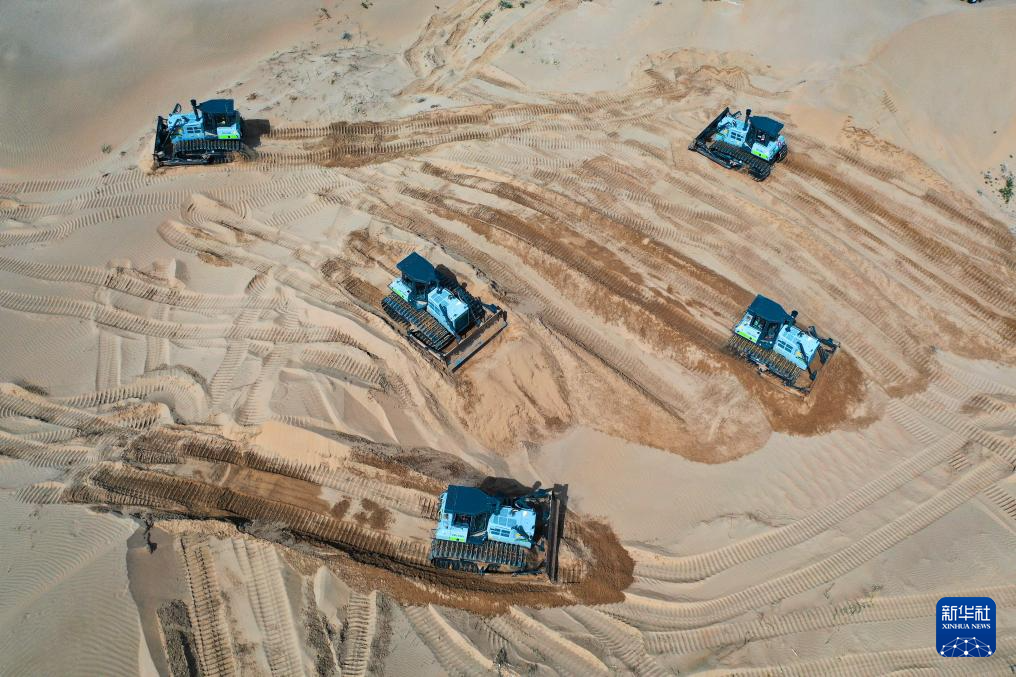 6月7日,在鄂爾多斯市達(dá)拉特旗境內(nèi)的庫(kù)布其沙漠,工程機(jī)械在平整沙地、開展光伏治沙工程建設(shè)(無人機(jī)照片)新華社記者 李志鵬 攝