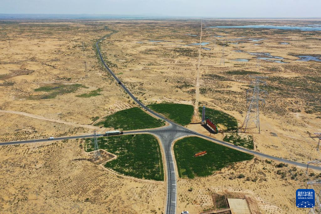 在巴彥淖爾市磴口縣,公路穿越烏蘭布和沙漠(6月5日攝,無人機(jī)照片)新華社記者 連振 攝
