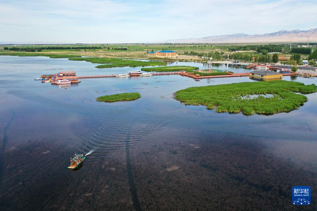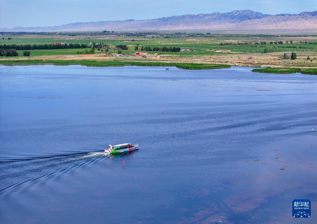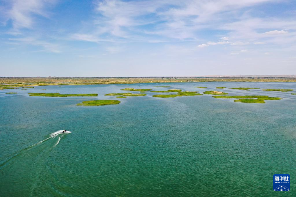 6月5日,在巴彥淖爾市磴口縣奈倫湖國(guó)家濕地公園,摩托艇行駛在湖面上(無人機(jī)照片)新華社記者 李志鵬 攝