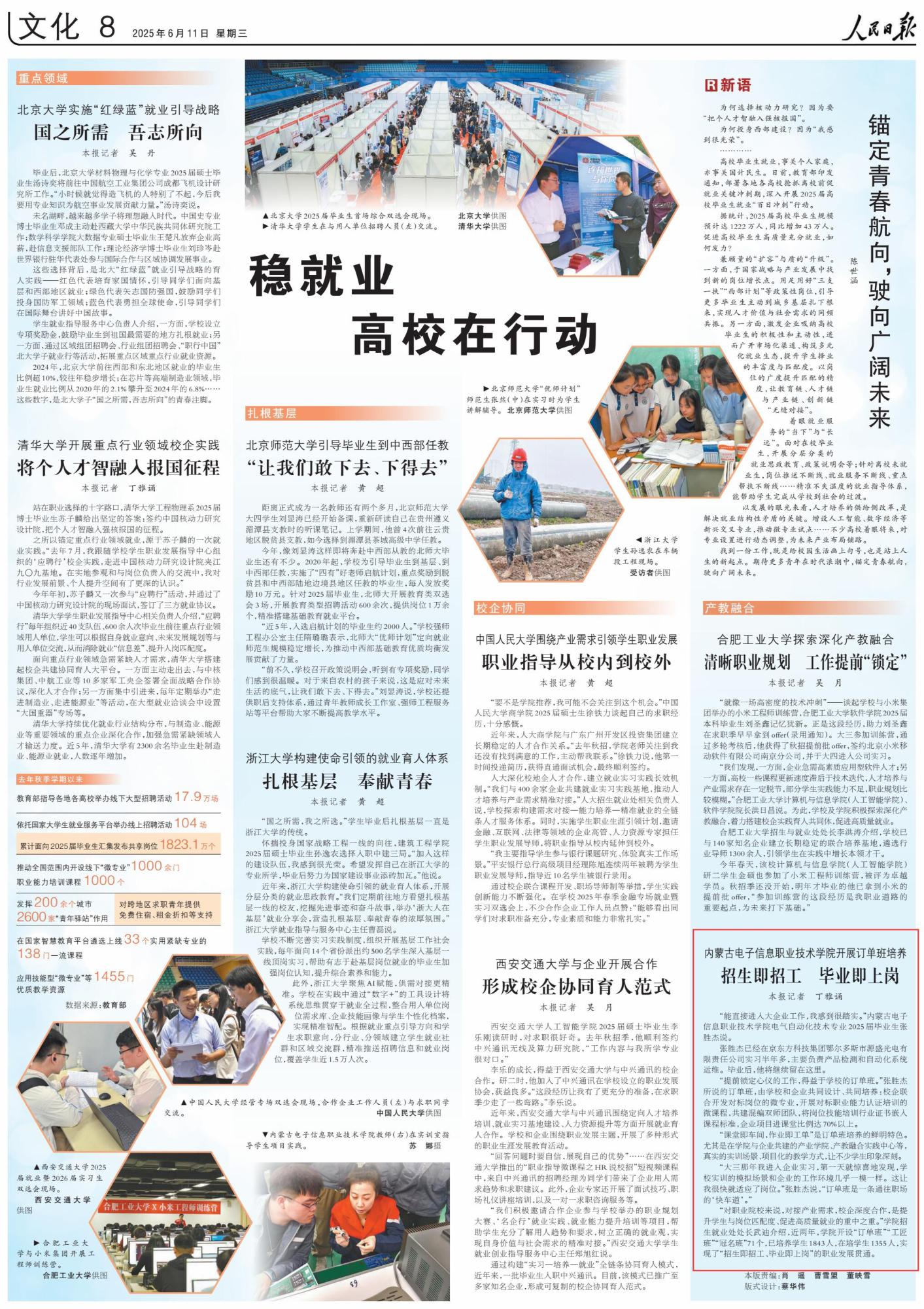 2025年6月11日,《人民日報》第8版刊發(fā)題為《內(nèi)蒙古電子信息職業(yè)技術(shù)學院開展訂單班培養(yǎng) 招生即招工 畢業(yè)即上崗》的文章,報道了內(nèi)蒙古電子信息職業(yè)技術(shù)學院開設“訂單班”“工匠班”“冠名班”,實現(xiàn)了“招生即招工、畢業(yè)即上崗”的職業(yè)發(fā)展貫通。