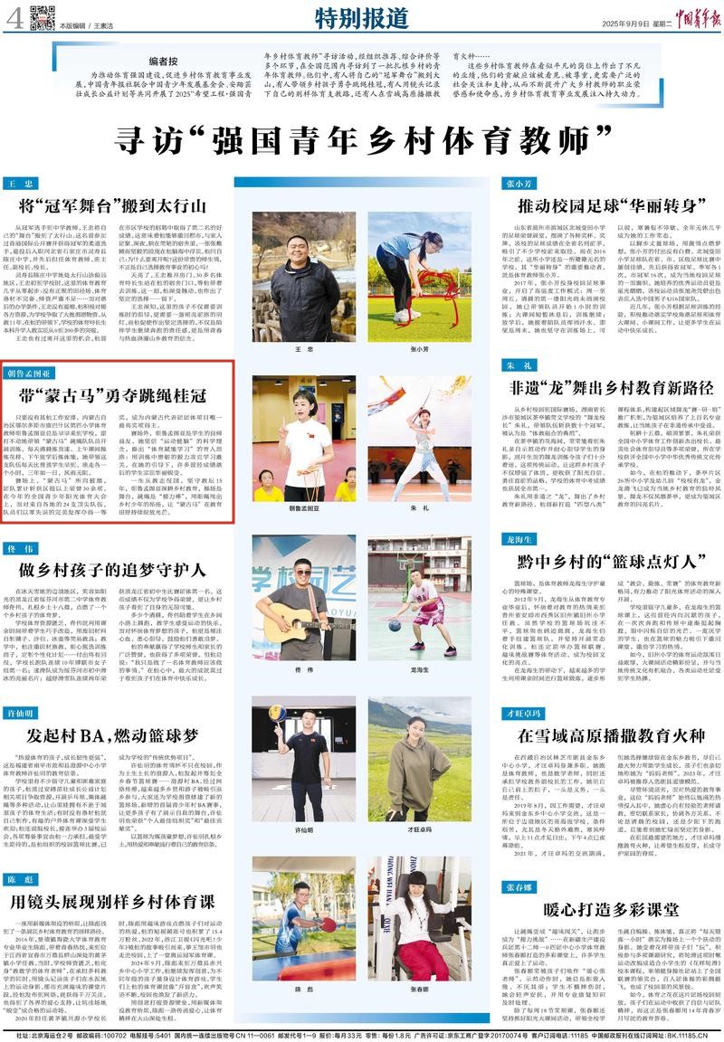 2025年9月9日,《中國青年報(bào)》第4版刊發(fā)題為《朝魯孟圖亞帶“蒙古馬”勇奪跳繩桂冠》的文章,報(bào)道了內(nèi)蒙古自治區(qū)鄂爾多斯市康巴什區(qū)第四小學(xué)體育教師朝魯孟圖亞深耕鄉(xiāng)村教育,用細(xì)繩甩出鄉(xiāng)村少年的昂揚(yáng),讓“蒙古馬”在教育田野持續(xù)綻放光芒。
