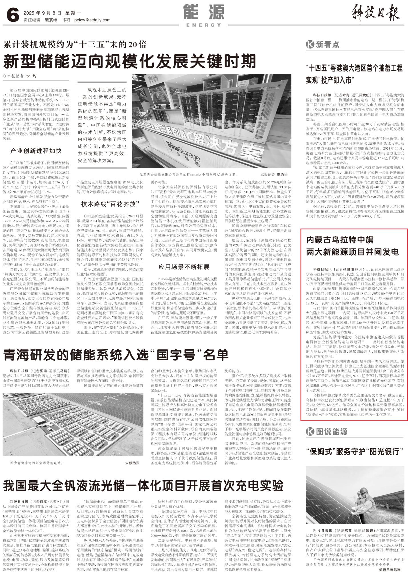 2025年9月8日,《科技日?qǐng)?bào)》第6版整版刊發(fā)題為《內(nèi)蒙古烏拉特中旗兩大新能源項(xiàng)目并網(wǎng)發(fā)電》的文章,報(bào)道了記者從內(nèi)蒙古巴彥淖爾市烏拉特中旗相關(guān)部門獲悉,全國(guó)首批規(guī)模性應(yīng)用單機(jī)10兆瓦風(fēng)電機(jī)組項(xiàng)目——內(nèi)蒙古能源集團(tuán)烏拉特中旗甘其毛都口岸50萬(wàn)千瓦靈活性綠色供電示范項(xiàng)目日前實(shí)現(xiàn)全容量并網(wǎng)。
