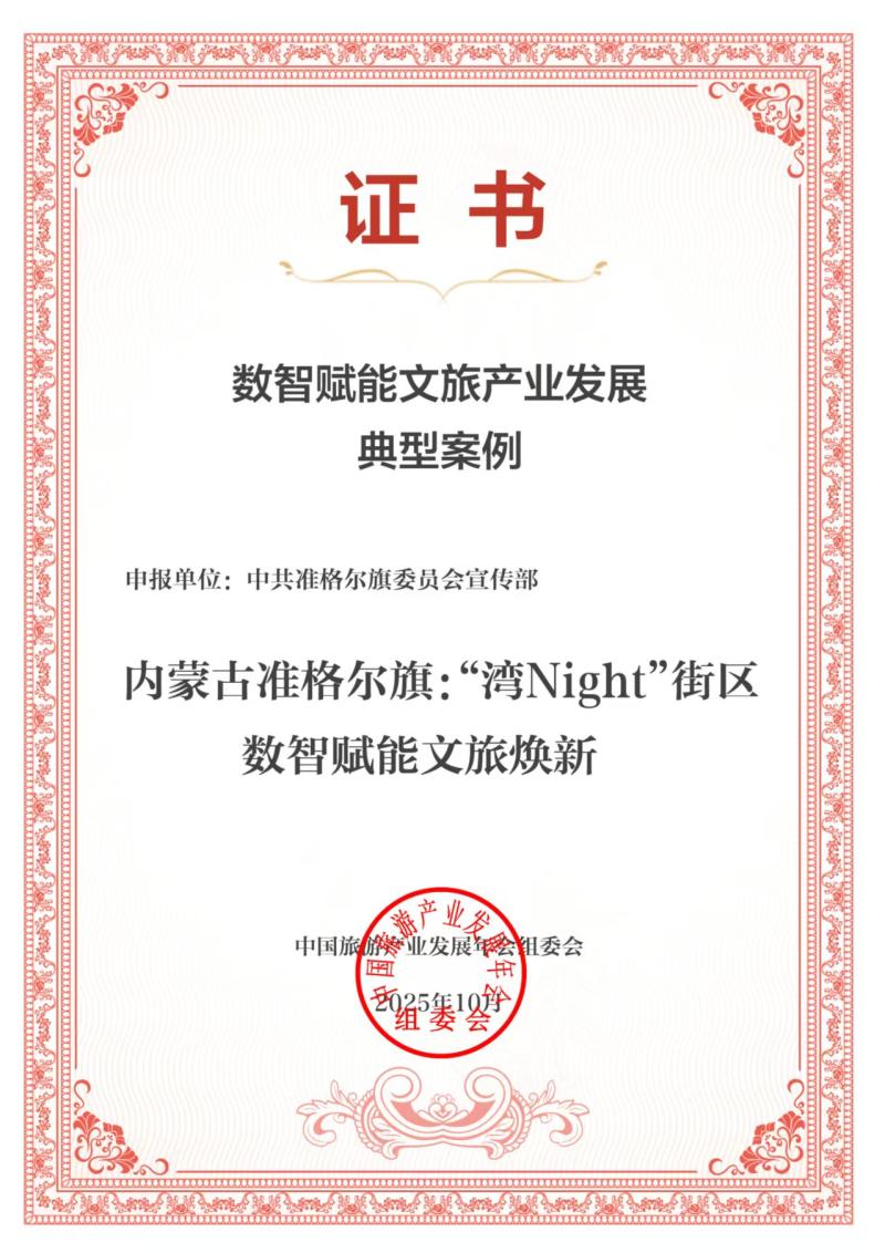 準(zhǔn)格爾旗“‘灣Night’街區(qū)數(shù)智賦能文旅煥新”案例成功入選2025數(shù)智賦能文旅產(chǎn)業(yè)發(fā)展典型案例。