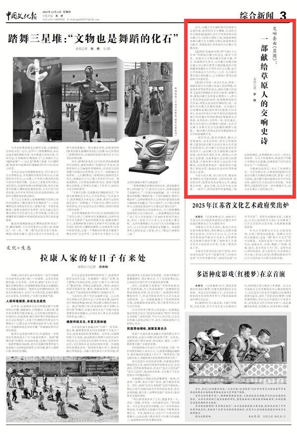 2025年12月4日《中國文化報(bào)》第3版刊發(fā)了《交響套曲《藍(lán)圖》:一部獻(xiàn)給草原人的交響史詩》的文章,報(bào)道了近日,內(nèi)蒙古藝術(shù)劇院委約作曲家方崠清作曲,曾偉擔(dān)任文學(xué)撰稿、作詞的大型交響套曲《藍(lán)圖》,在位于呼和浩特市的內(nèi)蒙古烏蘭恰特大劇院上演,指揮家黃屹執(zhí)棒內(nèi)蒙古藝術(shù)劇院交響樂團(tuán)演奏家合力獻(xiàn)藝,用國際語匯講述新時(shí)代內(nèi)蒙古發(fā)展故事。
