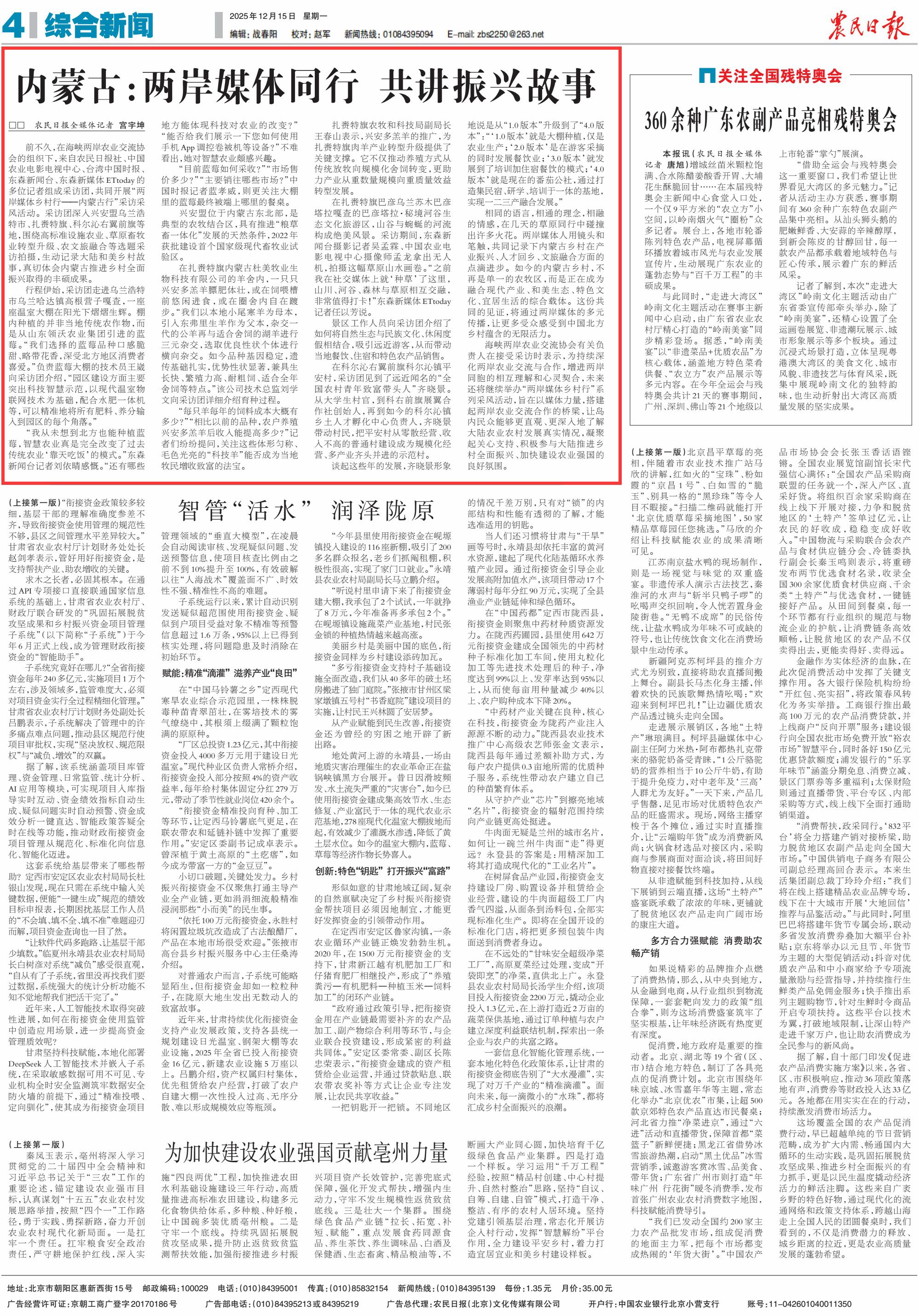 2025年12月15日《農(nóng)民日?qǐng)?bào)》第4版刊發(fā)了《內(nèi)蒙古:兩岸媒體同行 共講振興故事》的文章,報(bào)道了前不久,在海峽兩岸農(nóng)業(yè)交流協(xié)會(huì)的組織下,來(lái)自農(nóng)民日?qǐng)?bào)社、中國(guó)農(nóng)業(yè)電影電視中心、臺(tái)灣中國(guó)時(shí)報(bào)、東森新聞臺(tái)、東森新媒體ETtoday的多位記者組成采訪團(tuán),共同開(kāi)展“兩岸媒體鄉(xiāng)村行——內(nèi)蒙古行”采訪采風(fēng)活動(dòng)。兩岸媒體人用鏡頭和筆觸,共同記錄下內(nèi)蒙古鄉(xiāng)村在產(chǎn)業(yè)振興、人才回鄉(xiāng)、文旅融合方面的點(diǎn)滴進(jìn)步。這份共同的見(jiàn)證,將通過(guò)兩岸媒體的多元傳播,讓更多受眾感受到中國(guó)北方鄉(xiāng)村蘊(yùn)含的無(wú)限活力。