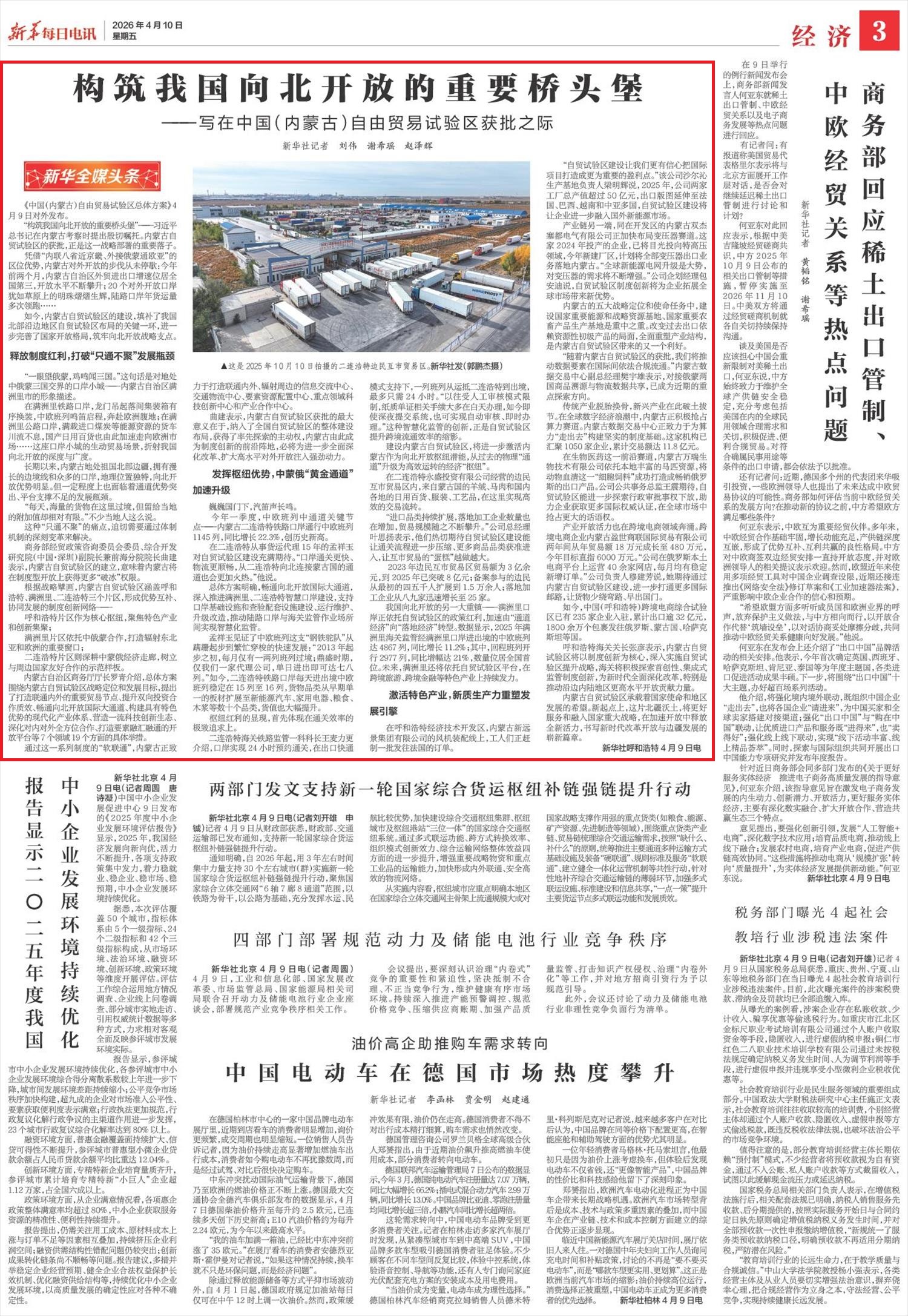 2026年4月10日,《新華每日電訊》第3版刊發(fā)題為《構(gòu)筑我國向北開放的重要橋頭堡——寫在中國(內(nèi)蒙古)自由貿(mào)易試驗區(qū)獲批之際》的文章,報道了《中國(內(nèi)蒙古)自由貿(mào)易試驗區(qū)總體方案》4月9日對外發(fā)布。內(nèi)蒙古自貿(mào)試驗區(qū)的建設(shè),填補了我國北部沿邊地區(qū)自貿(mào)試驗區(qū)布局的關(guān)鍵一環(huán),進一步完善了國家開放格局,筑牢向北開放戰(zhàn)略支點。