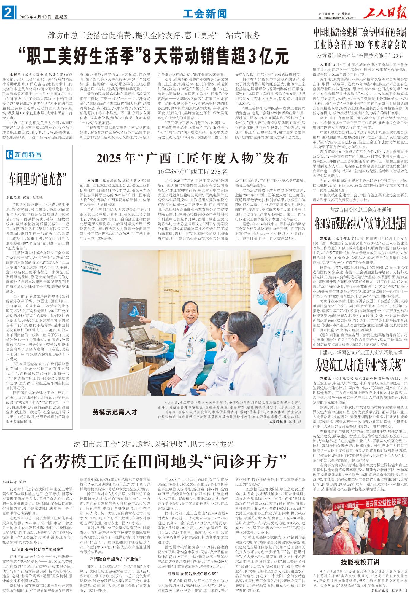 2026年4月10日,《工人日報》第2版刊發(fā)題為《內(nèi)蒙古自治區(qū)總工會發(fā)布通知 將30家百強民企納入“產(chǎn)改”重點推進范圍》的文章,報道了內(nèi)蒙古自治區(qū)總工會發(fā)布《關(guān)于進一步加強全區(qū)百強民營企業(yè)深化產(chǎn)業(yè)工人隊伍建設(shè)改革工作的通知》,明確將本盟市區(qū)域內(nèi)尚未列入“產(chǎn)改”項目試點、綜合示范點或助推企業(yè)名單的30家自治區(qū)民企100強企業(yè),全部納入本級“產(chǎn)改”重點推進企業(yè)范圍,實現(xiàn)百強民企“產(chǎn)改”工作全覆蓋。