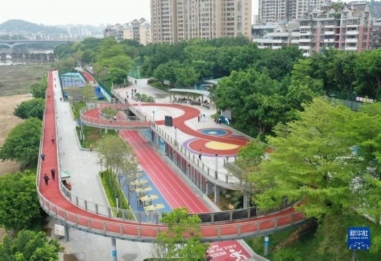4月24日拍攝的福州市鼓樓區(qū)西河智慧體育公園內(nèi)智慧跑道、智慧健身器材及健身驛站等(無人機照片)。