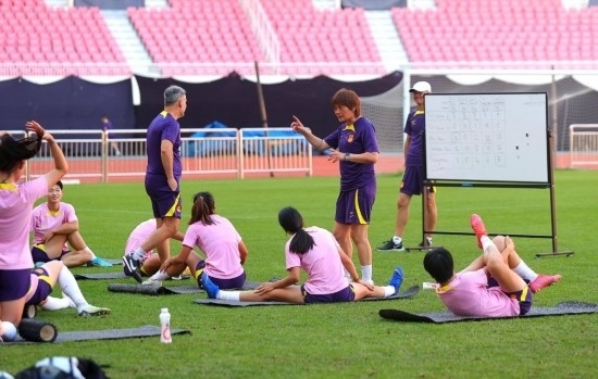 7月5日,中國(guó)女足主教練水慶霞(右三)點(diǎn)評(píng)訓(xùn)練情況。新華社記者 丁旭 攝