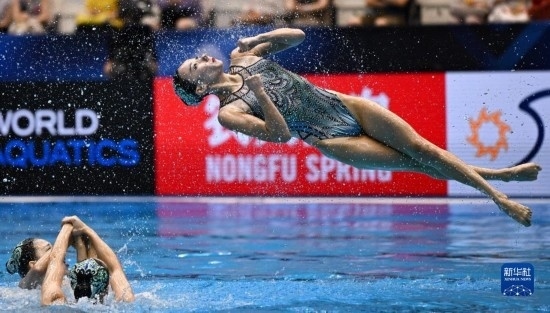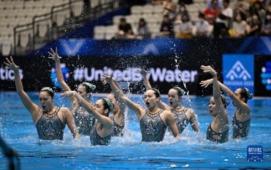 7月21日,中國隊(duì)在比賽中。當(dāng)日,在日本福岡舉行2023年世界游泳錦標(biāo)賽花樣游泳集體自由自選決賽中,中國隊(duì)以329.1687分的成績獲得冠軍。新華社記者 夏一方 攝