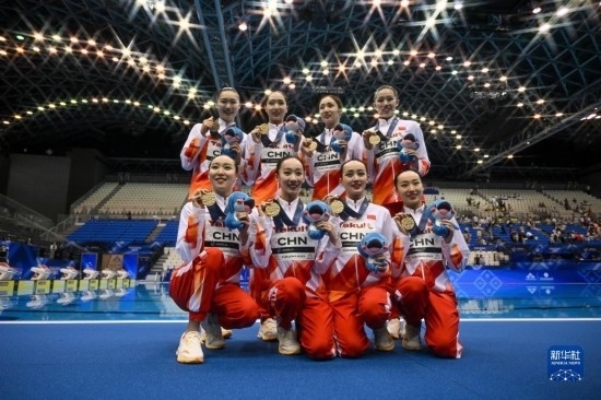 在花游集體自由自選決賽中,預(yù)賽排名第一的中國隊(duì)發(fā)揮出最好水平,所有難度動(dòng)作都得到認(rèn)定,以329.1687分奪冠。日本隊(duì)和烏克蘭隊(duì)分獲銀牌和銅牌。