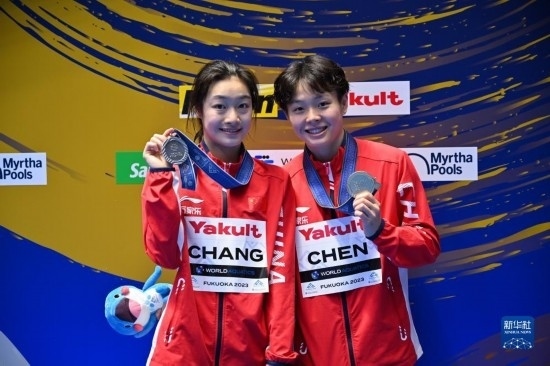 7月21日,冠軍中國選手陳藝文(右)和亞軍中國選手昌雅妮在頒獎(jiǎng)儀式上。當(dāng)日,在日本福岡舉行的2023年世界游泳錦標(biāo)賽跳水女子單人三米板決賽中,中國選手陳藝文、昌雅妮分別以359.50分和341.50分的成績包攬冠亞軍。新華社記者 張笑宇 攝