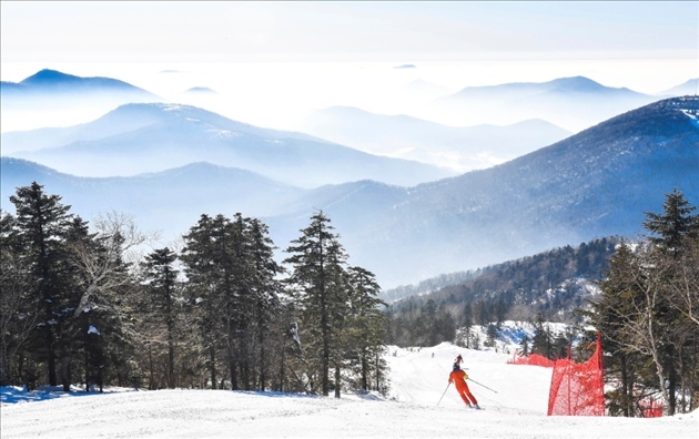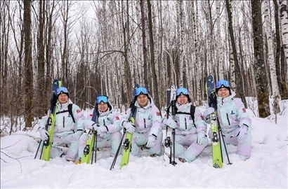 在新疆白云國際滑雪場,許秀娟(右)在給愛人和兒子拍照。哈爾濱人許秀娟曾是專業(yè)運動員,代表國家隊拿過國際大賽獎牌。退役后她來到新疆,在這里她和愛人相識,一起開辦培訓(xùn)機構(gòu),面向青少年推廣冰雪運動。