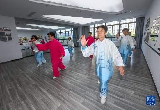 8月24日,在湖州市龍泉街道市陌河社區(qū),老人們?cè)趨⒓佑瓉嗊\(yùn)健身活動(dòng)。