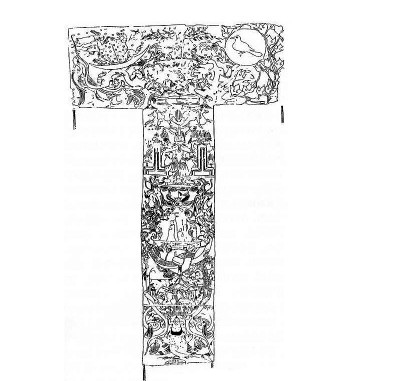 解讀出漢墓帛畫中殘月所蘊含的時間密碼,再看整幅T形帛畫。我們看到馬王堆漢墓帛畫形制上最重要的特征,就是非常特殊的T字形狀。中央由三張絹布整幅拼成,中軸描繪了天、承載墓主人魂魄的魂車和地下世界三部分。這樣的三段模式在漢畫像石中并不少見。一如曾部川寬指出的那樣,真正造成這個T字形特殊形狀的,是在中軸的左右增加了描繪太陽和描繪月亮的部分。我想之所以特地增加出日月這兩部分,一定是因為有特別的需要。那么,這需要是什么呢?當我們解讀清楚在帛畫上段左側(cè)描繪的月世界的殘月所蘊含的特殊時間密碼,再去看右側(cè)對稱處特地畫出九個太陽組成的畫面,我們自然會想到《山海經(jīng)》中扶桑木與十日的神話故事,與蟾蜍、玉兔、殘月等圖像展示的主題一樣,這應該同樣是一個與時間循環(huán)密切相關(guān)的故事主題。日與月在這里并不單純是代表性的天文標志物。他們展示的都是時間的循環(huán),和在時間循環(huán)中死而復生的主題。本文就此止筆于月相的分析。有關(guān)太陽的循環(huán),以后再展開討論。