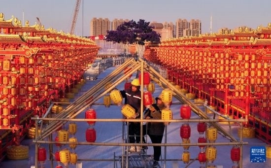 1月23日,工人在河北省唐山市豐南區(qū)河頭老街景區(qū)掛燈籠(無人機(jī)照片)。