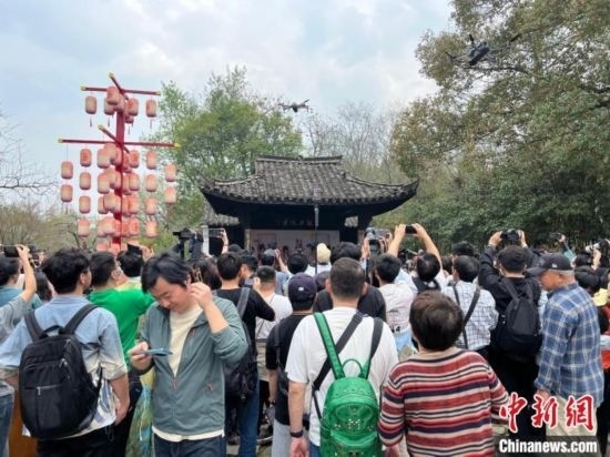 游客在西溪深潭口古戲臺觀看花朝節(jié)相關(guān)儀式。 王題題 攝
