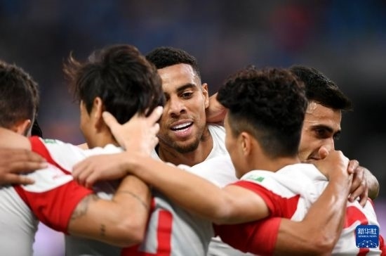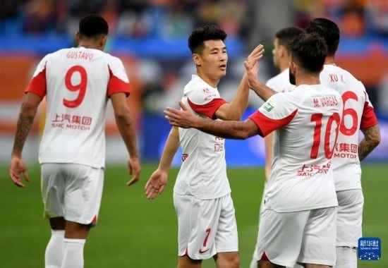 5月1日,上海海港隊(duì)球員古斯塔沃(中)在比賽中與隊(duì)友慶祝進(jìn)球。