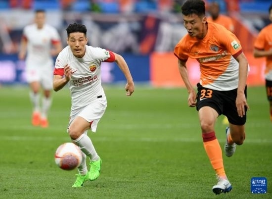 5月1日,上海海港隊(duì)球員武磊(左)在比賽中帶球突破。