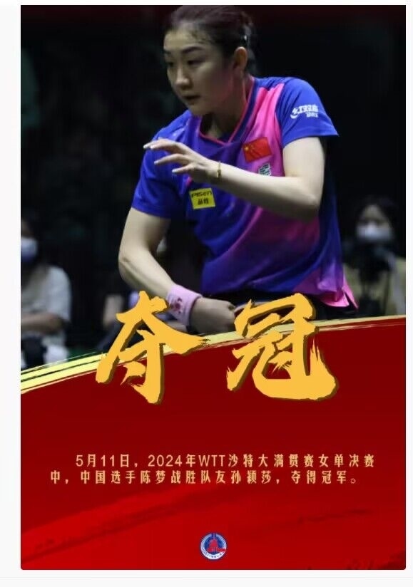 今天,在2024年WTT沙特大滿(mǎn)貫賽女單決賽中,中國(guó)選手陳夢(mèng)戰(zhàn)勝隊(duì)友孫穎莎 ,奪得冠軍。祝賀陳夢(mèng),孫穎莎辛苦了!拼過(guò)就是勝利,繼續(xù)加油?。ㄓ浾撸和鹾V蓿?/p>