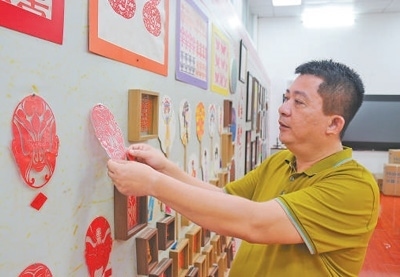 周繼川將學生的瓊劇剪紙作品張貼在展覽室。本報記者 曹文軒攝