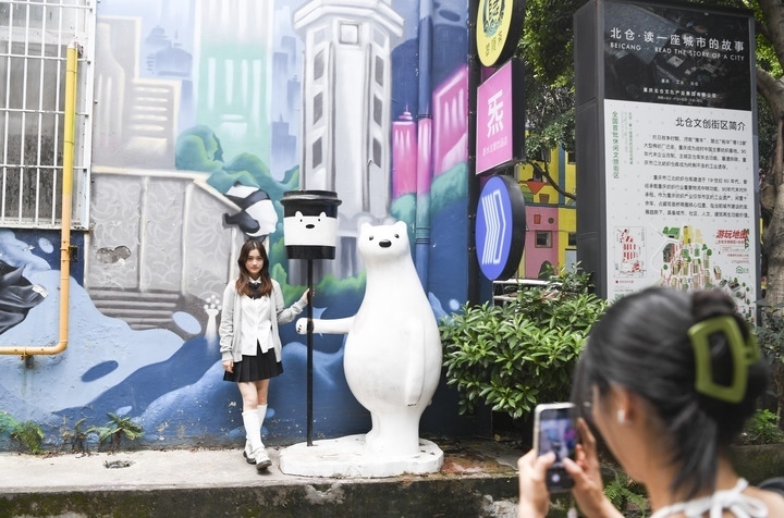 圖為游客在重慶江北區(qū)北倉(cāng)文創(chuàng)街區(qū)拍照。新華社記者王全超 攝