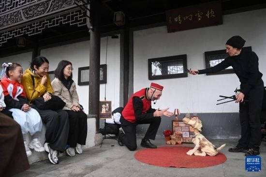 10月27日,來(lái)自意大利的藝術(shù)表演者在南潯古鎮(zhèn)宜園為游客表演輕喜偶劇。