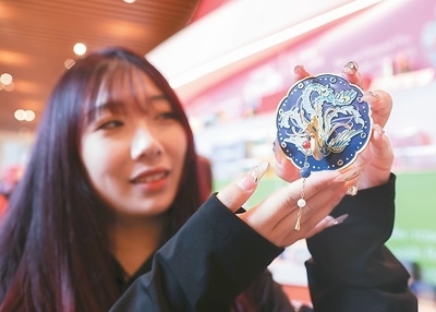 2023年12月16日,觀眾在中華世紀壇舉辦的圓明印象·皇家“游”禮文創(chuàng)設(shè)計展欣賞文創(chuàng)作品。新華社記者 羅曉光攝