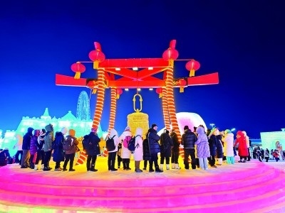 游客在哈爾濱冰雪大世界參加祈福活動(dòng)。