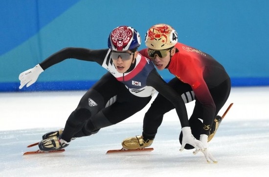 2月9日,中國(guó)隊(duì)選手林孝埈(右)、韓國(guó)隊(duì)選手樸智元在比賽中發(fā)生身體碰撞。新華社記者 顏麟蘊(yùn) 攝
