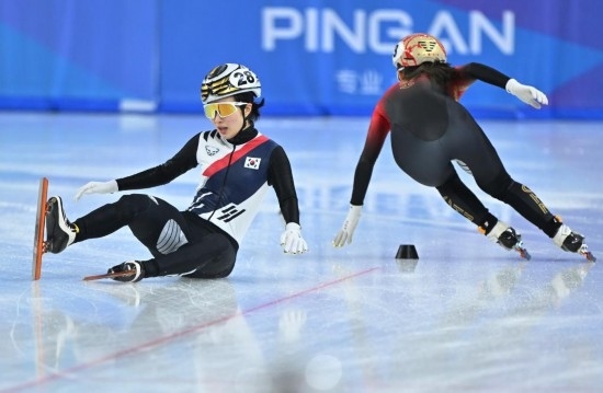 2月9日,中國(guó)隊(duì)選手公俐(右)在比賽中沖刺,韓國(guó)隊(duì)選手金吉莉在比賽中摔倒。新華社記者 江漢 攝