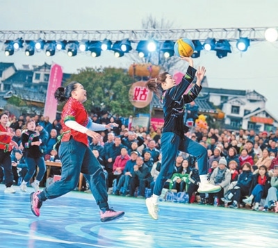 場上,身著特色服飾的婦女們或懷抱籃球健步如飛,或三五成群笑鬧爭球;場邊,蘆笙悠揚,錦雞舞、銅鼓舞輪番上陣,十二道攔門酒的醇香與觀眾的喝彩匯成獨特的苗味交響。傳統(tǒng)頭帕與運動發(fā)帶相得益彰,古法藍染與熒光記分屏互相映襯,這場縣城里的活力賽事,流淌著千年苗韻,躍動著時代脈搏。