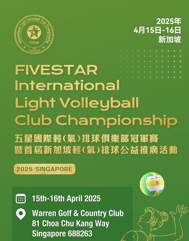 2025年4月15日至16日,2025“五星”國際輕(氣)排球俱樂部冠軍賽將在新加坡Warren Golf &Country Club啟幕,這也是氣排球首次登陸新加坡。