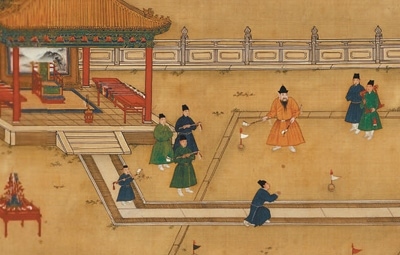 捶者,打也;丸者,球也?!安簧賹W(xué)生剛接觸捶丸時(shí),說它像現(xiàn)代的高爾夫。其實(shí),捶丸比高爾夫運(yùn)動(dòng)歷史更悠久?!逼巾斏綄W(xué)院陶瓷學(xué)院院長(zhǎng)梅國(guó)建介紹,捶丸源自唐代擊鞠(馬球)和步打球,傳至宋朝逐漸演變?yōu)橐来螕羟虻姆菍?duì)抗性比賽,名稱也變?yōu)榇吠?,現(xiàn)藏于故宮博物院的《明宣宗行樂圖》中就描繪了宮中捶丸的場(chǎng)景。