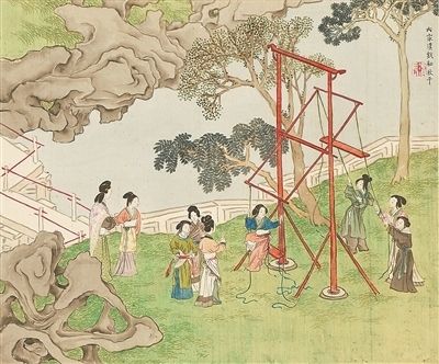 秋千,古稱“千秋”,可追溯至春秋時(shí)期,后改為“秋千”。據(jù)《荊楚歲時(shí)記》記載:“春時(shí)懸長(zhǎng)繩于高木,士女衣彩服坐于其上而推引之,名曰打秋千。”在古代,清明節(jié)更是有著秋千節(jié)的別稱,可見古人對(duì)春日蕩秋千的喜愛。